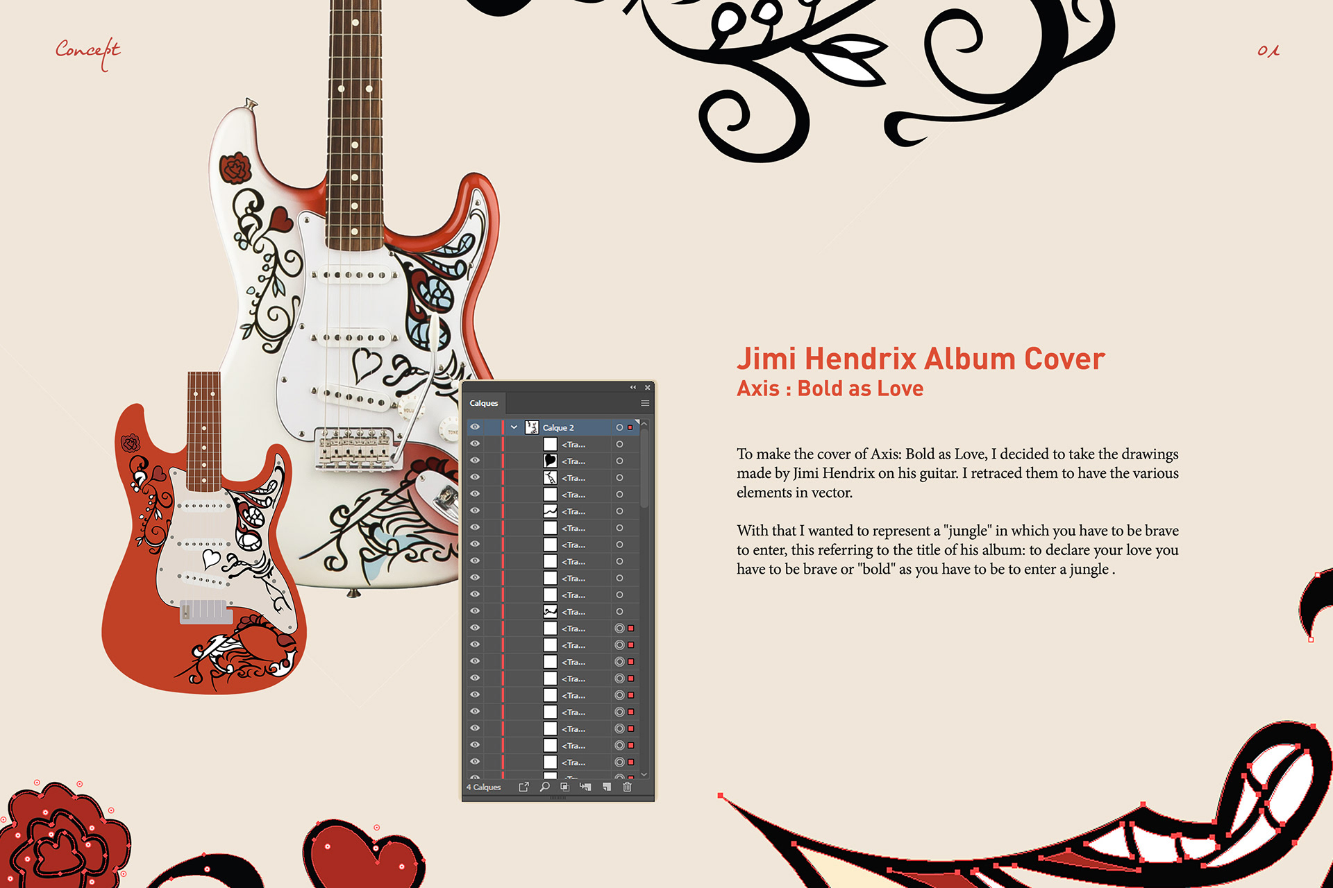 Travail réalisé dans le cadre de mes études, le sujet était de créer une pochette d'album d'un artiste de son choix. J'ai choisi Jimi Hendrix, artiste que j'aime particulièrement pour sa richesse musicale.